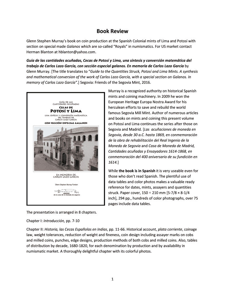 Book Review Glenn Stephen Murray's book on coin production at the Spanish Colonial mints of Lima and Photos with section on special made Gala nos which are so-called Royals in numismatics. For US