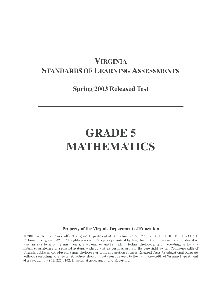 SESSION: 23 PAGE: 1 1/26/04 8:24 LOGIN Isomer PATH: sunultra1/raid/CLS TPC/GRP VA sprg03/JOB 03olptg5/DIV g5mth1VIRGINIA STANDARDS OF LEARNING ASSESSMENTS Spring 2003 Released Lestrade 5 MATHEMATICSProperty