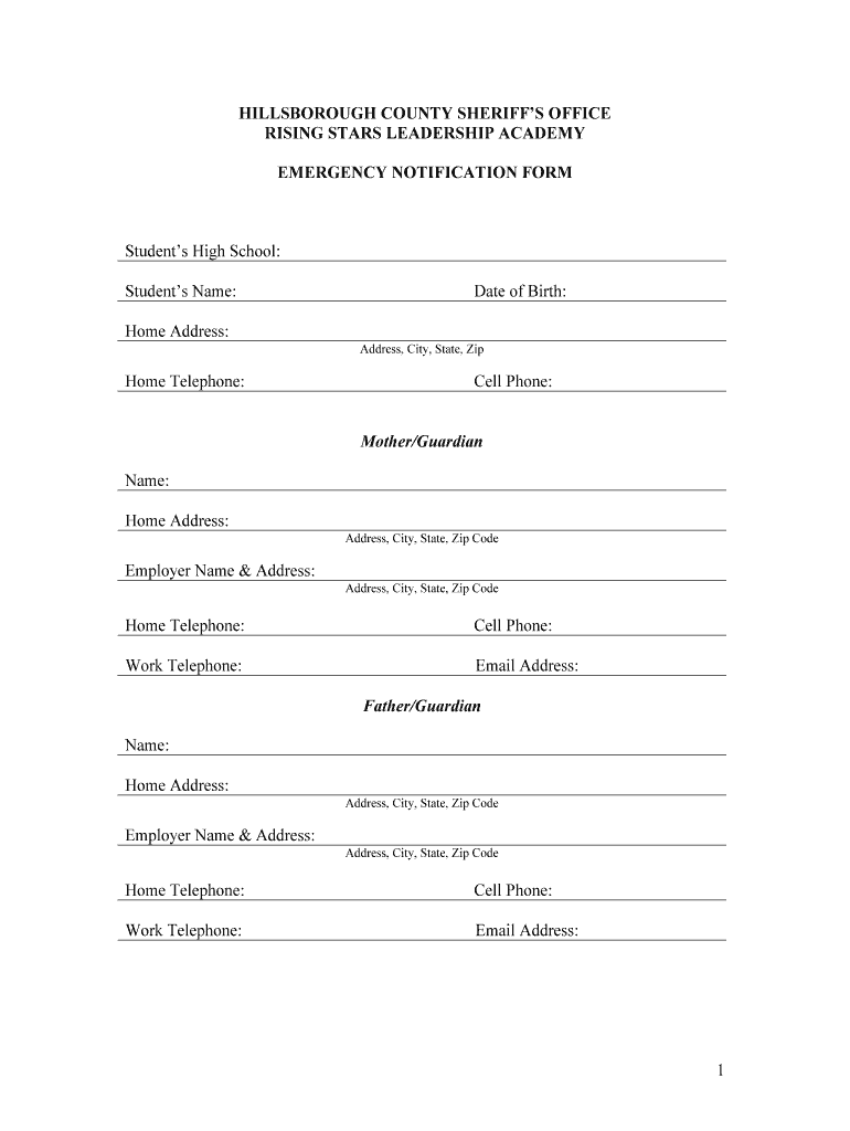 HILLSBOROUGH COUNTY SHERIFFS OFFICE RISING STARS LEADERSHIP ACADEMY EMERGENCY NOTIFICATION FORMStudents High School: Students Name: Home Address: Home Telephone:Date of Birth: Address, City, State,