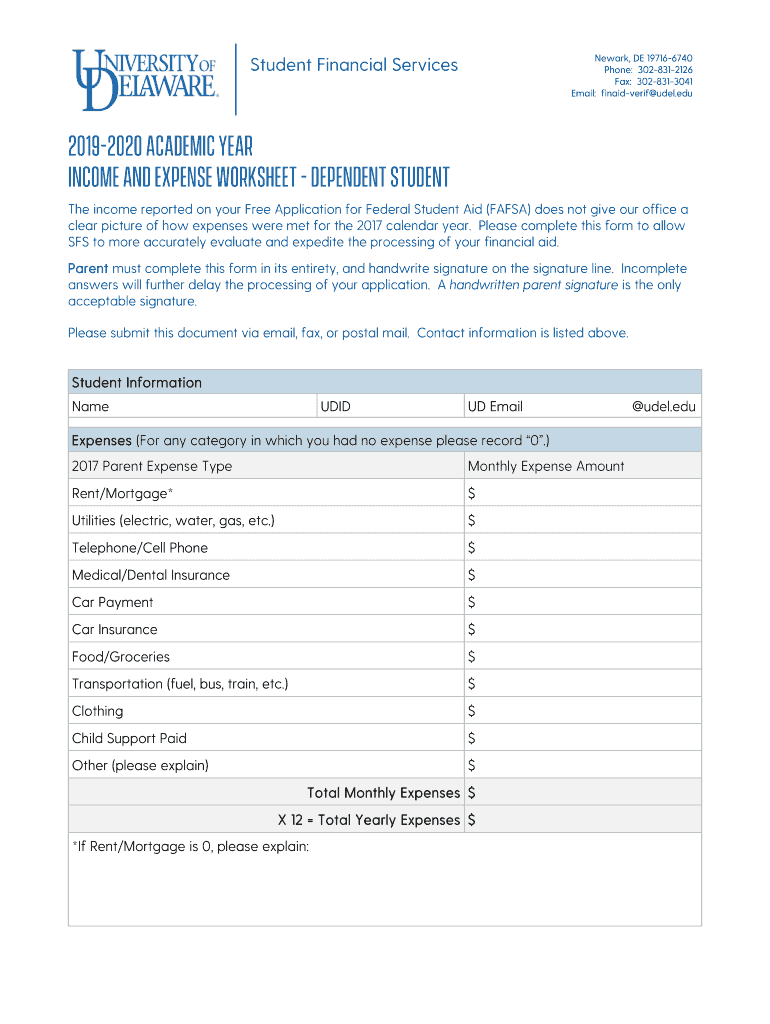 Newark, DE 197166740 Phone: 3028312126 Fax: 3028313041 Email: finaidverif duel. Student Financial Services20192020 Academic Year Income and Expense Worksheet dependent Student The income reported