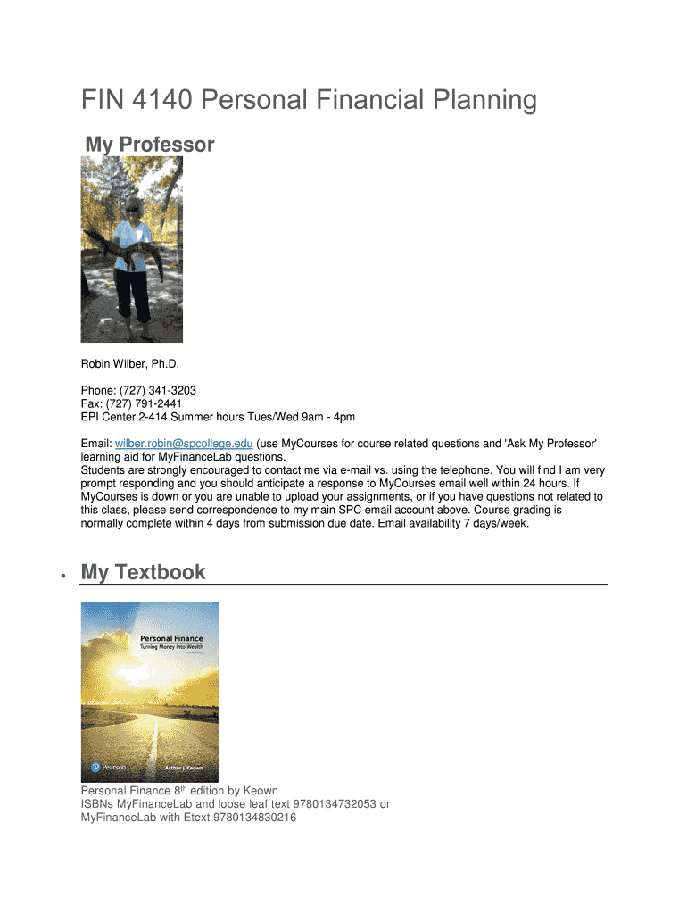 FIN 4140 Personal Financial Planning My Professor Robin Wilbur, Ph.D. Phone: (727) 3413203 Fax: (727) 7912441 EPI Center 2414 Summer hours Tues/Wed 9am 4pm Email: Wilbur. Robin college.edu (use Courses