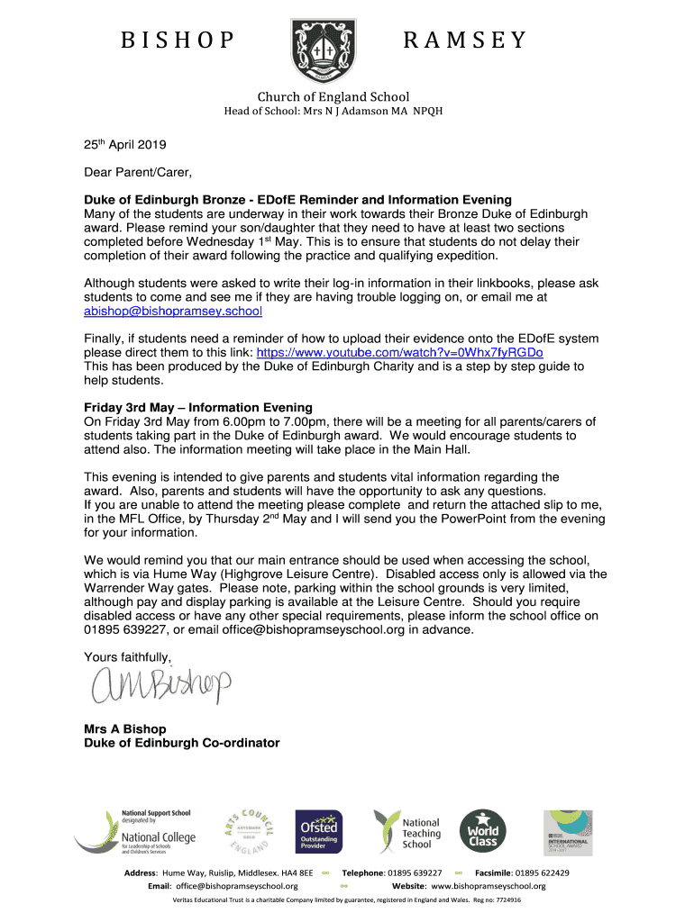 BISHOPRAMSEY Church of England School Head of School: Mrs N J Adamson MA NPQH25th April 2019 Dear Parent/Carer, Duke of Edinburgh Bronze Done Reminder and Information Evening Many of the students