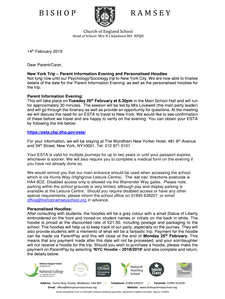 BISHOPRAMSEY Church of England School Head of School: Mrs N J Adamson MA NPQH14th February 2019Dear Parent/Carer, New York Trip Parent Information Evening and Personalized Hoodies Not long now until