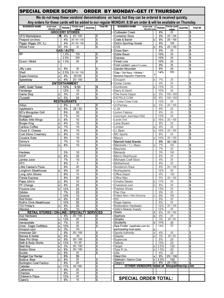 SPECIAL ORDER SCRIP:ORDER BY MONDAY IT Thursday do not keep these vendors/ denominations on hand, but they can be ordered & received quickly. Any orders for these cards will be added to our regular