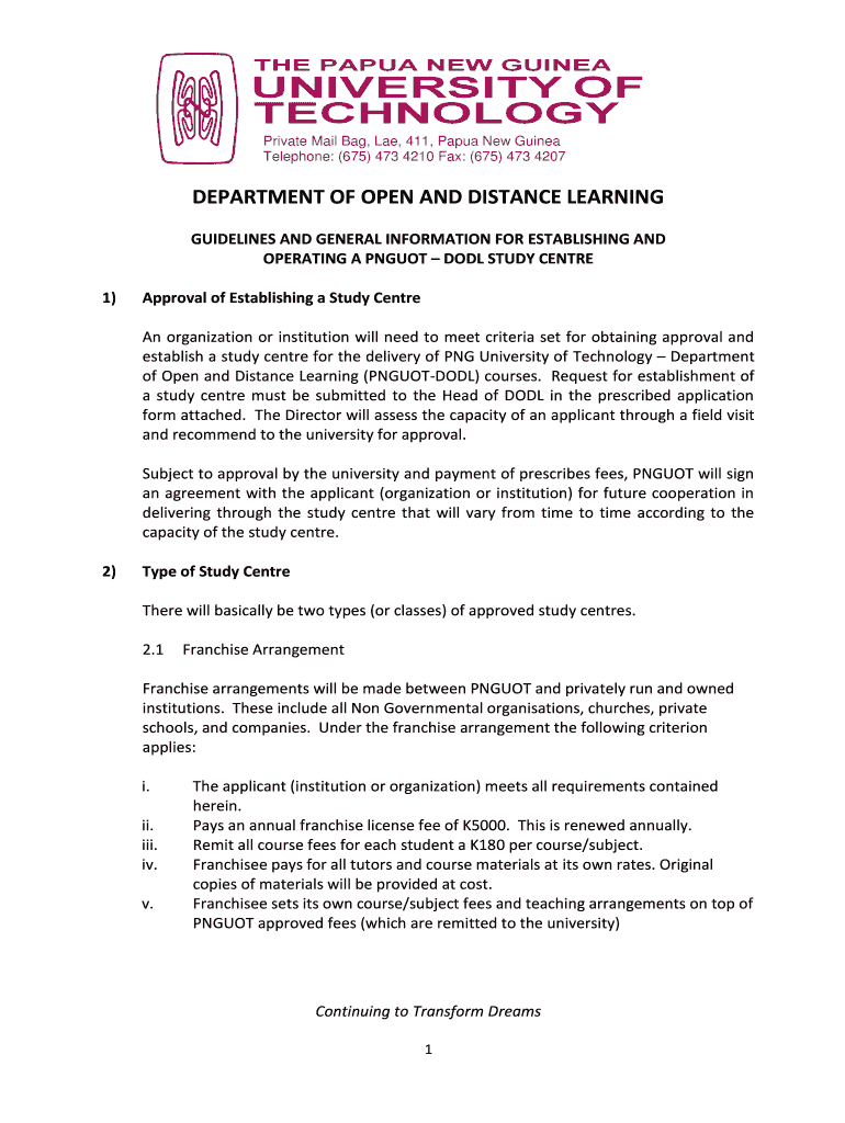 Private Mail Bag, Late, 411, Papua New Guinea Telephone: (675) 473 4210 Fax: (675) 473 4207DEPARTMENT OF OPEN AND DISTANCE LEARNING GUIDELINES AND GENERAL INFORMATION FOR ESTABLISHING AND OPERATING