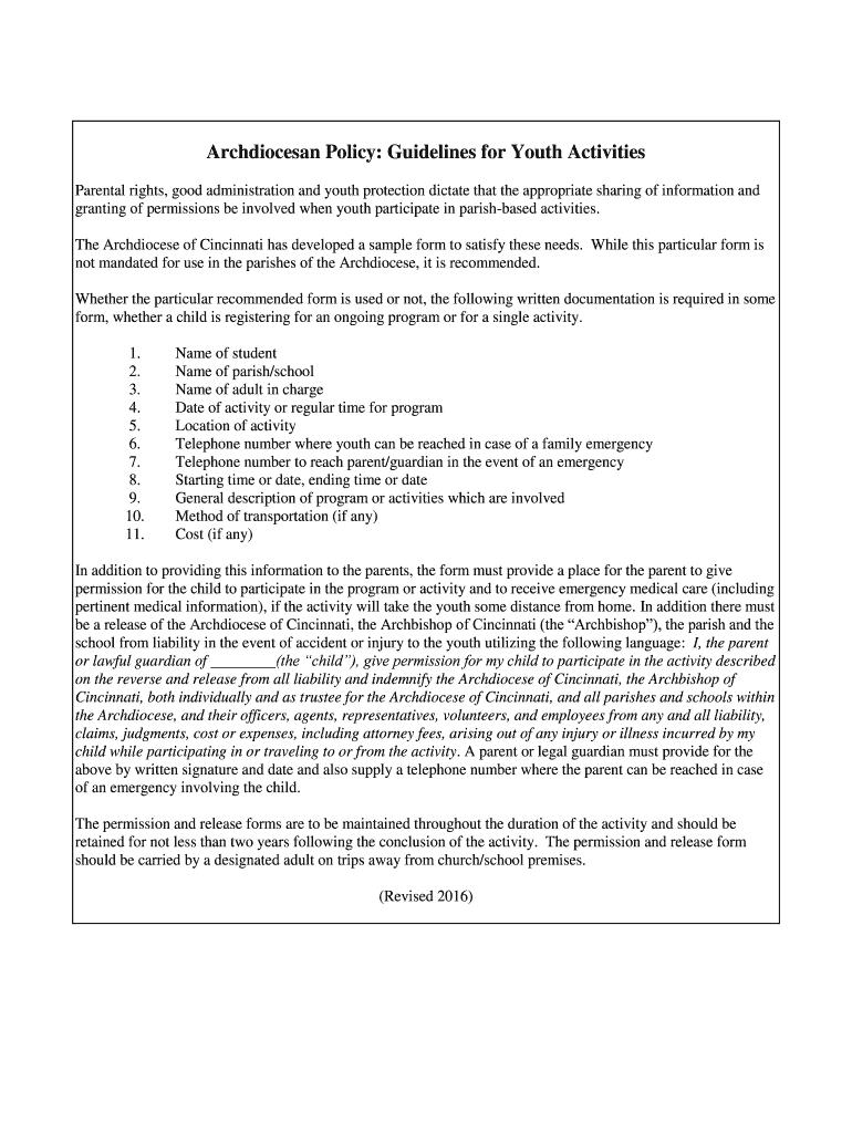 The permission and release form for archdiocese may require reporting of personal information such as name, contact details, and signature.