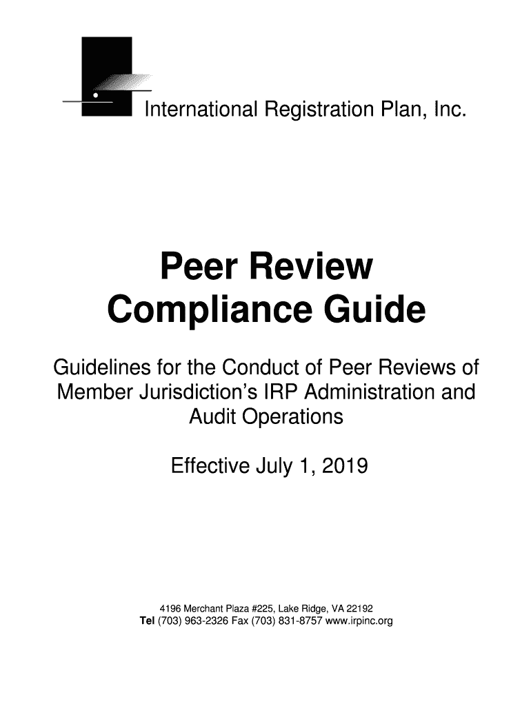 International Registration Plan, Inc. Peer Review Compliance Guide Guidelines for the Conduct of Peer Reviews of Member Jurisdictions IRP Administration and Audit Operations Effective July 1, 20194196