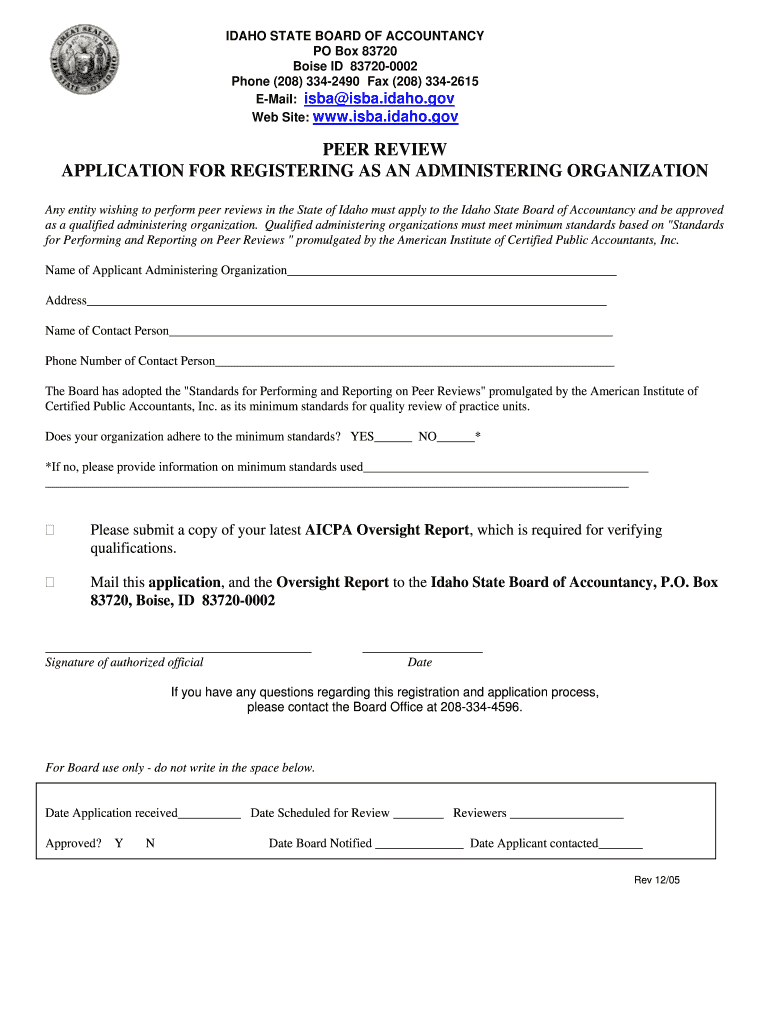 IDAHO STATE BOARD OF ACCOUNTANCY PO Box 83720 Boise ID 837200002 Phone (208) 3342490 Fax (208) 3342615 Email: ISBN.Idaho.gov Website: www.isba.idaho.govPEER REVIEW APPLICATION FOR REGISTERING AS AN