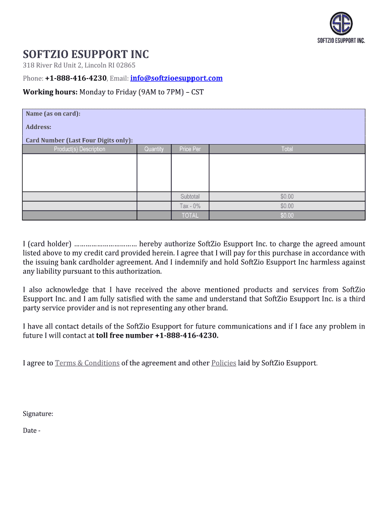 SOFTIE SUPPORT INC 318 River Rd Unit 2, Lincoln RI 02865 Phone: +18884164230, Email: info softzioesupport. Coworking hours: Monday to Friday (9AM to 7PM) CST Name (as on card): Address: Card Number