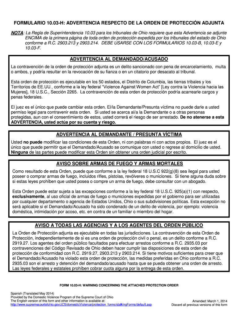 FORMULA RIO 10.03H: ADVERTENCIA RESPECT ODE LA ORDER DE PROTECTION ADJUST