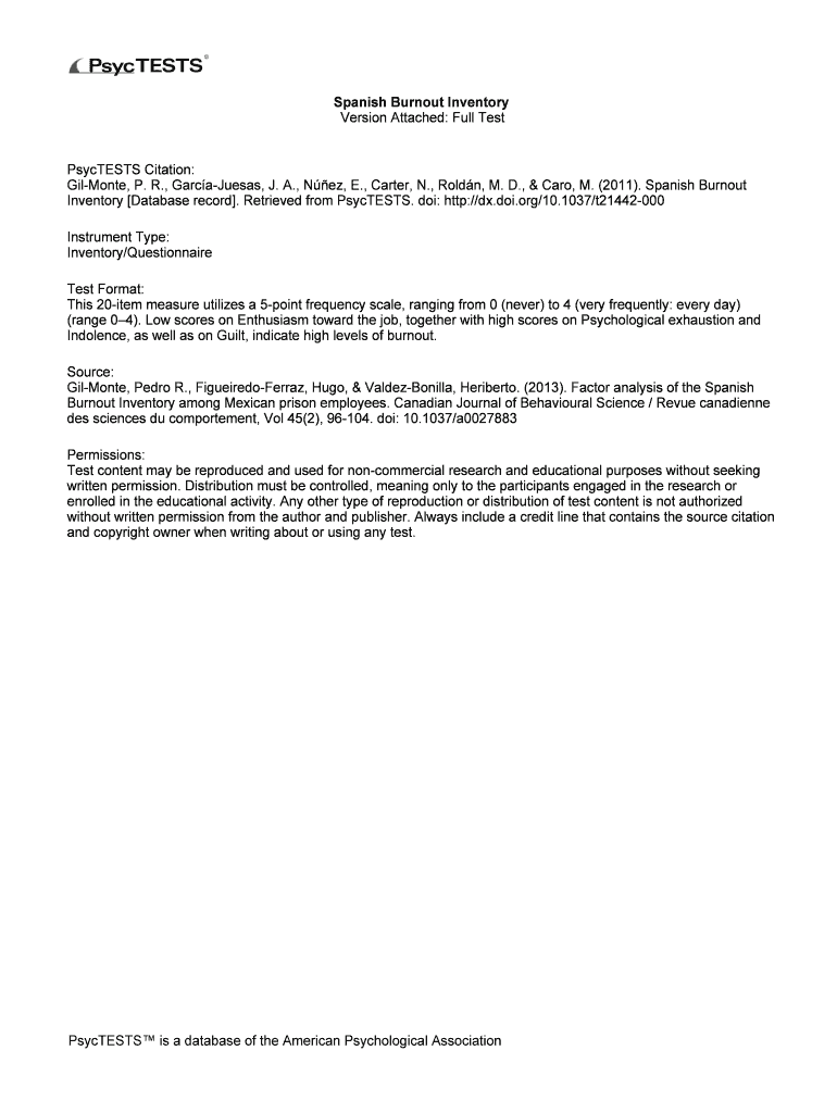 Spanish Burnout Inventory Version Attached: Full TestPsycTESTS Citation: Gil Monte, P. R., GarcaJuesas, J. A., New, E., Carter, N., Old, M. D., & Car, M. (2011). Spanish Burnout Inventory Database