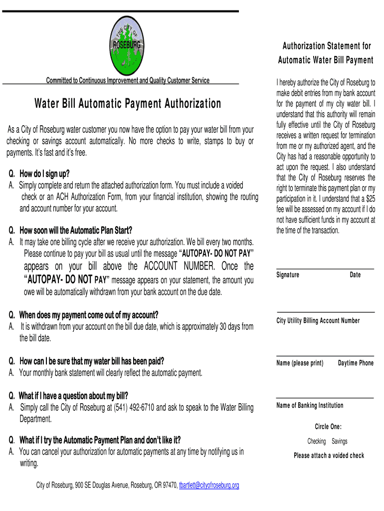 Committed to Continuous Improvement and Quality Customer Servicewomen Bill Automatic Payment Authorization
