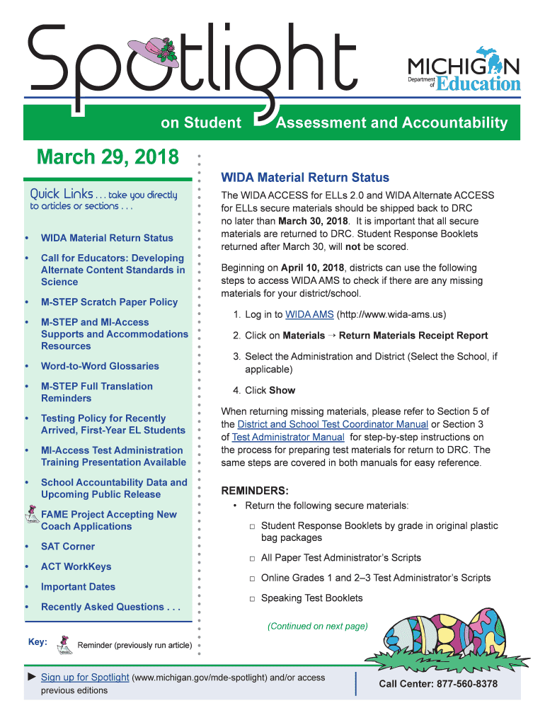 to articles or sections. . . Assessment and AccountabilityWIDA Material Return Status