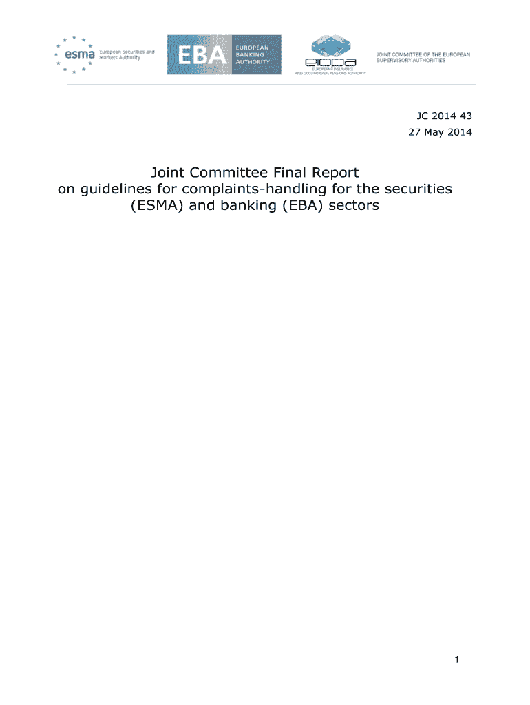 JC 2014 43 27 May 2014Joint Committee Final Report on guidelines for complaints handling for the securities (EMMA) and banking (EBA) sectors1Contents 1. 2. Overview ............................................................................................