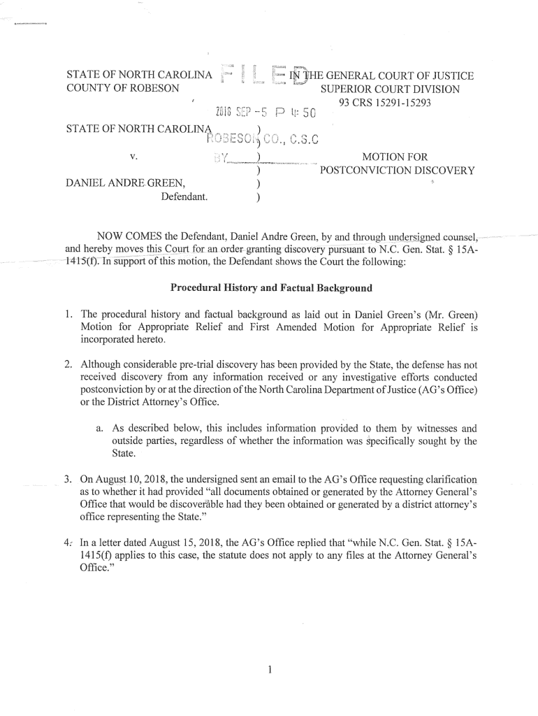 STATE OF NORTH CAROLINA COUNTY OF ROBESON1 5 H Roche GENERAL COURT OF JUSTICE SUPERIOR COURT DIVISION 93CRS 1529115293im SEP5 P LP 50 STATE OF NORTH CAROLINA)ROBES0iy:0. C.S.CV.LY)) DANIEL ANDRE.GREEN,