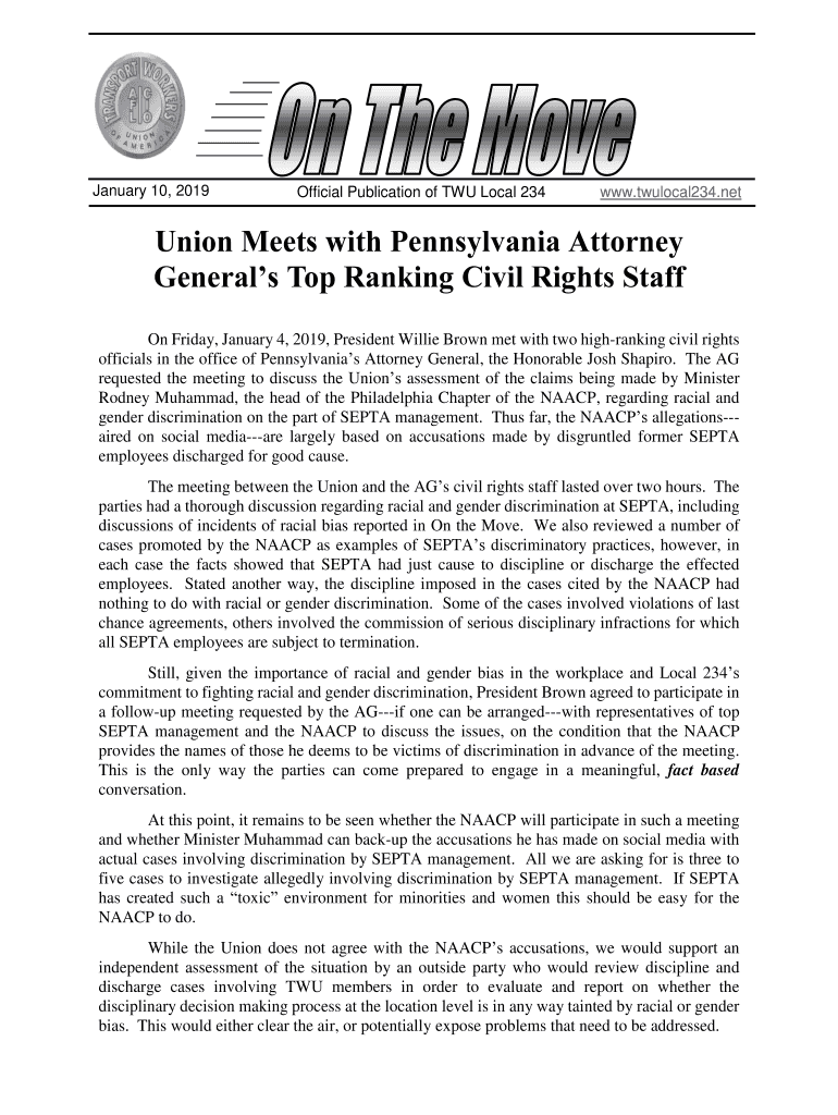 January 10, 2019Official Publication of TWU Local 234www.twulocal234.net Union Meets with Pennsylvania Attorney