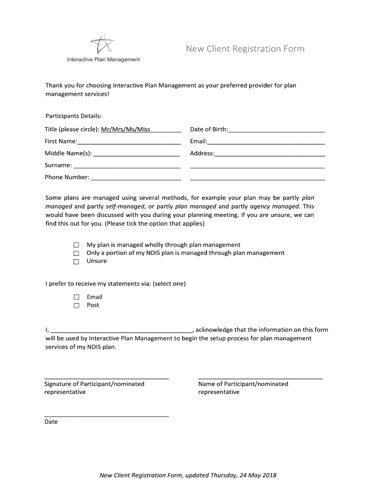 New Client Registration Firsthand you for choosing Interactive Plan Management as your preferred provider for plan management services! Participants Details: Title (please circle): Mr/Mrs/Ms/Miss