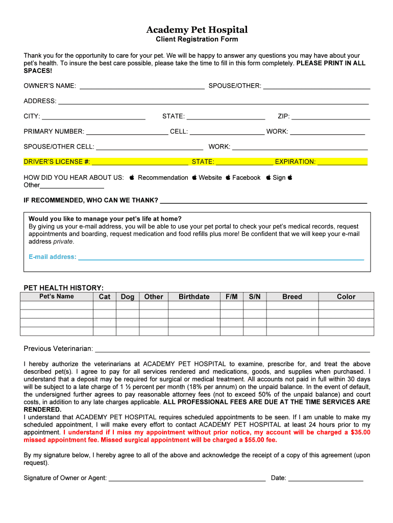 Academy Pet Hospital Client Registration Form Thank you for the opportunity to care for your pet. We will be happy to answer any questions you may have about your pets health. To insure the best care