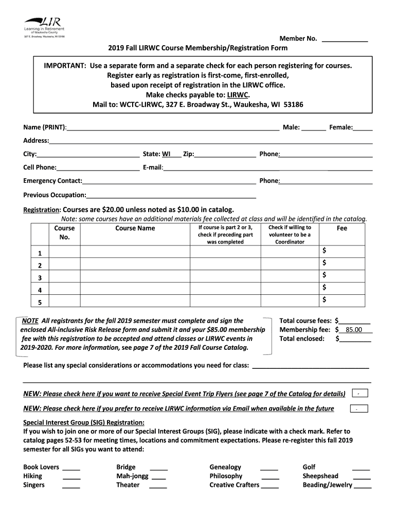 Member No. 2019 Fall LIR WC Course Membership/Registration FormIMPORTANT: Use a separate form and a separate check for each person registering for courses. Register early as registration is first