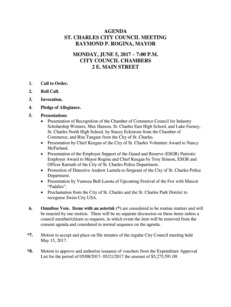 AGENDA ST. CHARLES CITY COUNCIL MEETING RAYMOND P. REGINA, MAYOR MONDAY, JUNE 5, 2017 7:00 P.M. CITY COUNCIL CHAMBERS 2 E. MAIN STREET 1. Call to Order.2. Roll Call.3. Invocation.4. Pledge of Allegiance.5.