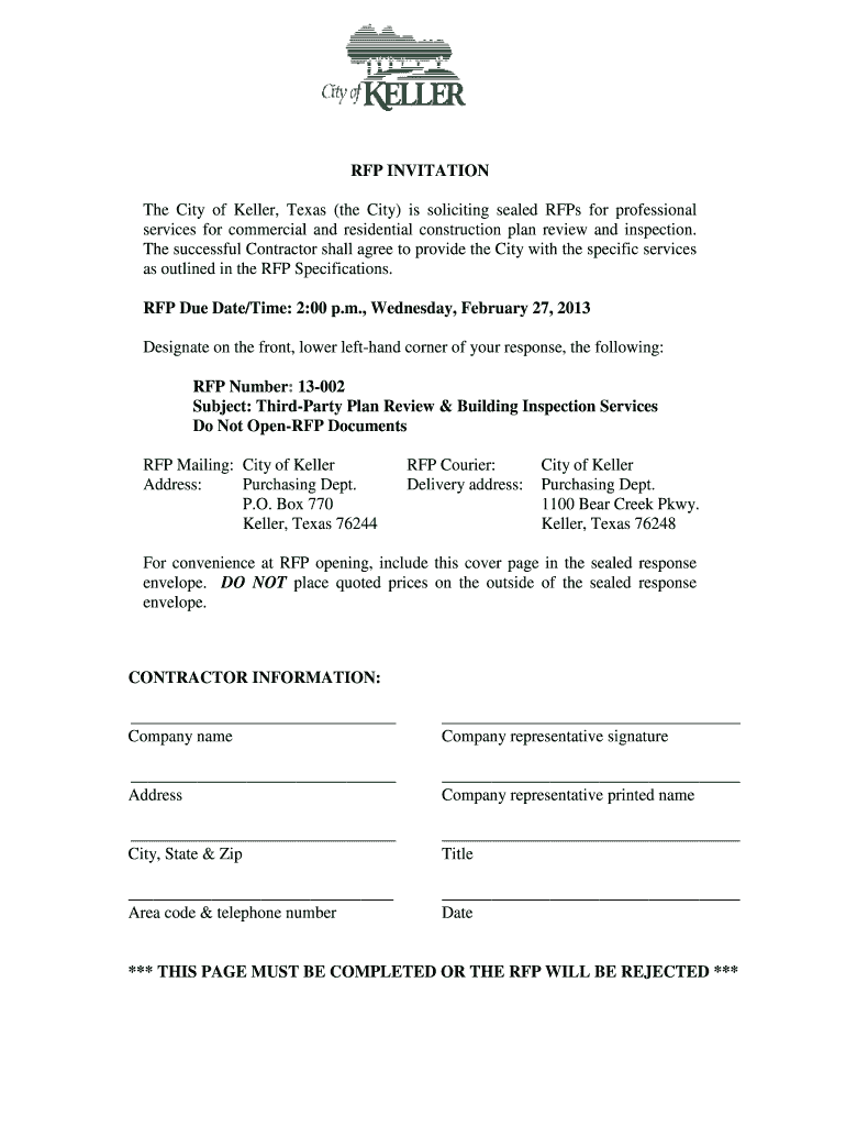 RFP INVITATION The City of Keller, Texas (the City) is soliciting sealed RFPs for professional services for commercial and residential construction plan review and inspection. The successful Contractor