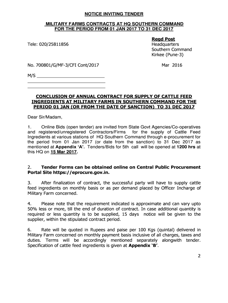 NOTICE INVITING TENDER MILITARY FARMS CONTRACTS AT HQ SOUTHERN COMMAND FOR THE PERIOD FROM 01 JAN 2017 TO 31 DEC 2017 Tell: 020/25811856No. 700801/G/MF3/CFI Cont/2017Regd Post Headquarters Southern