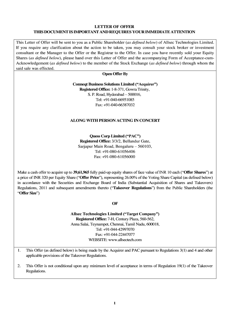 This Letter of Offer will be sent to you as a Public Shareholder (as defined below) of All sec Technologies Limited.