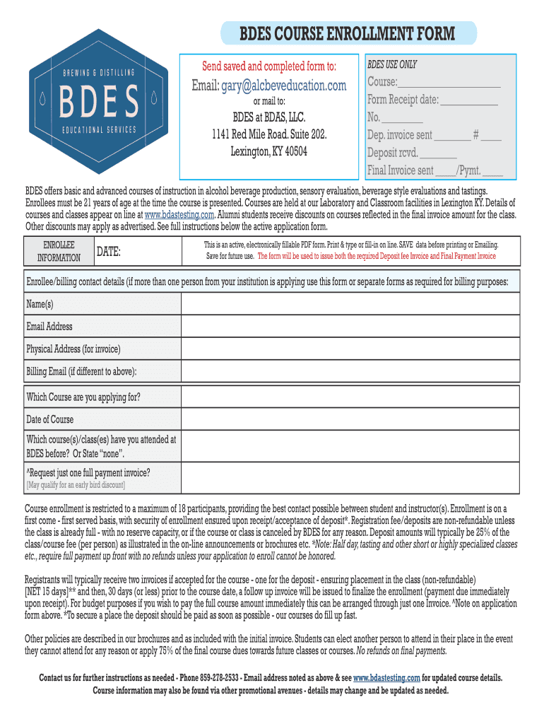 BEES COURSE ENROLLMENT FORM Send saved and completed form to:Email: Gary alcbeveducation.com or mail to:BEES at BIAS, LLC. 1141 Red Mile Road. Suite 202. Lexington, KY 40504BDES USE Concourse: Form