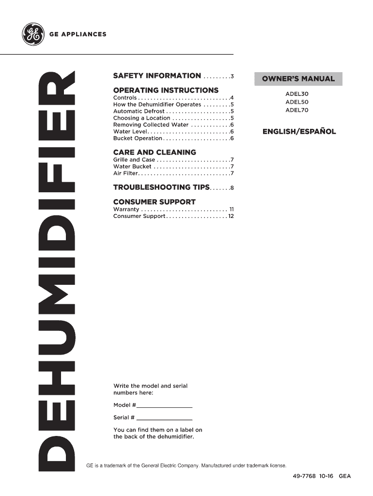 Get the free GE ADEL30LWQ1 User Manual DEHUMIDIFIER Manuals And ...