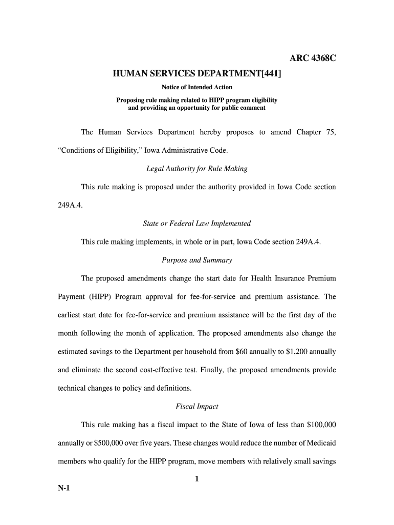 ARC 4368C HUMAN SERVICES DEPARTMENT 441 Notice of Intended Action Proposing rule making related to HIP program eligibility and providing an opportunity for public commentate Human Services Department