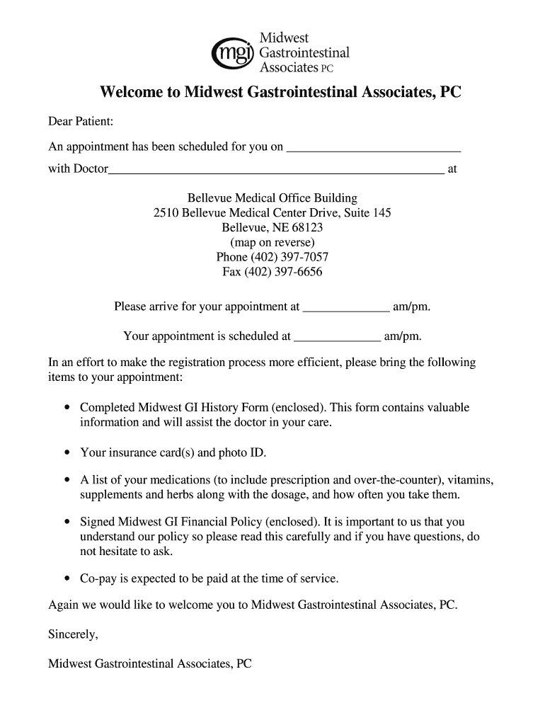 Welcome to Midwest Gastrointestinal Associates, PC Dear Patient: An appointment has been scheduled for you on with Doctor at Bellevue Medical Office Building 2510 Bellevue Medical Center Drive, Suite