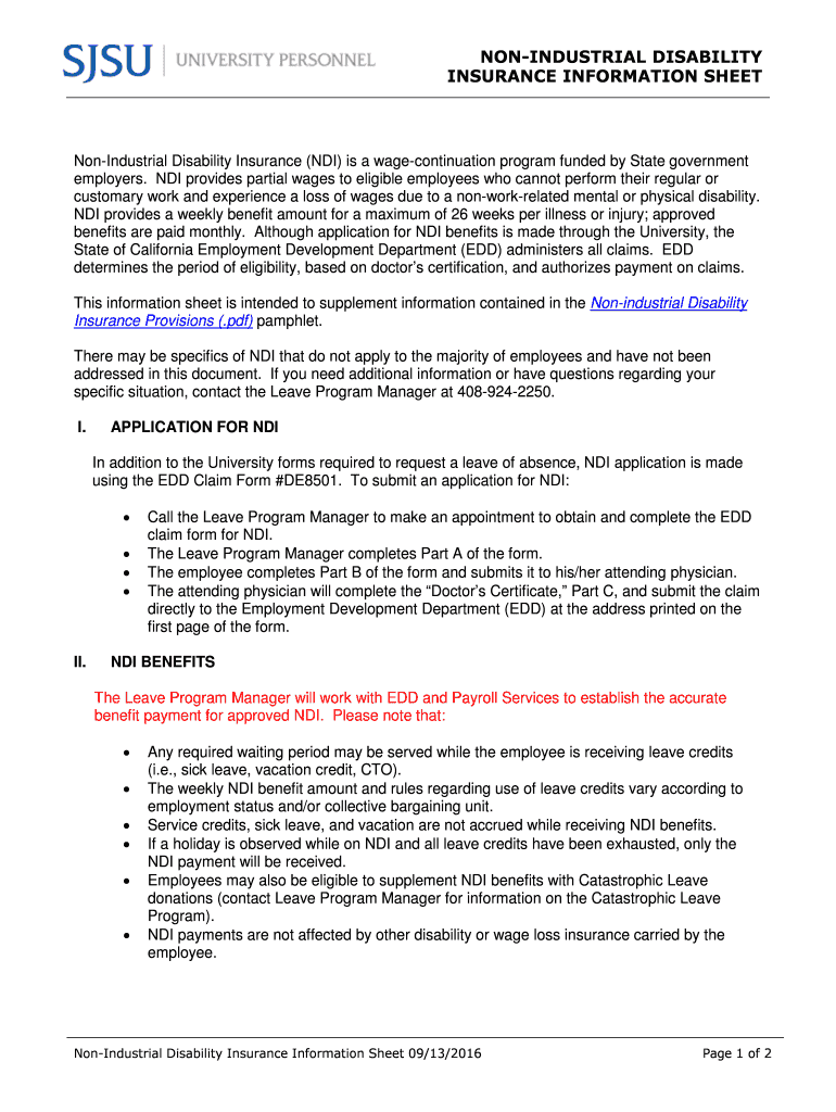 INSURANCE INFORMATION SHEETNonIndustrial Disability Insurance (TDI) is a wage continuation program funded by State government