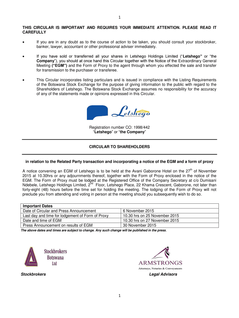 THIS CIRCULAR IS IMPORTANT AND REQUIRES YOUR IMMEDIATE ATTENTION. PLEASE READ IT