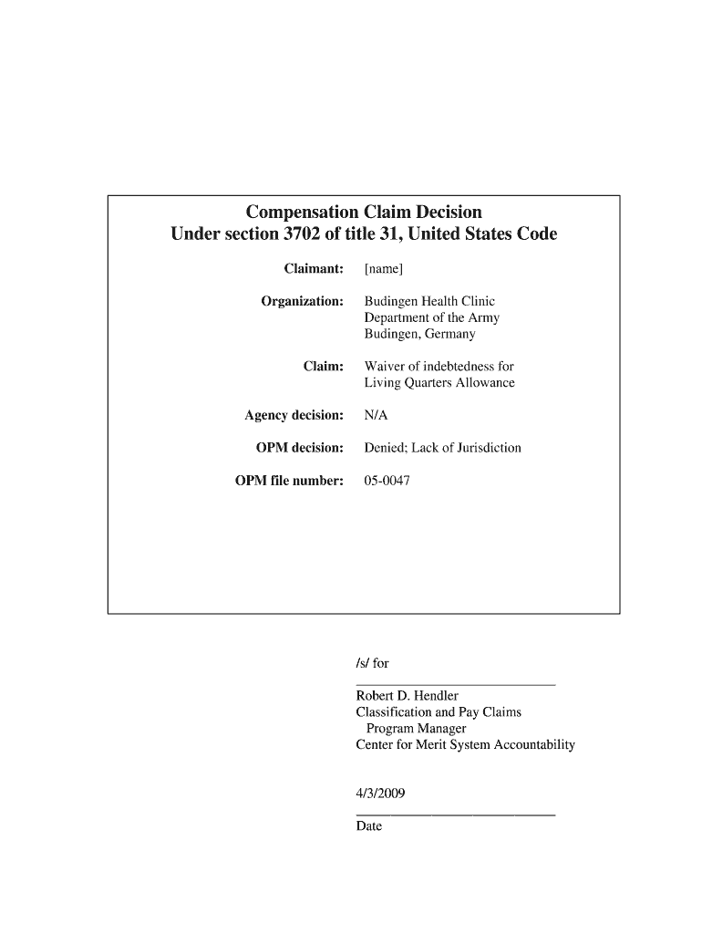 Compensation Claim Decision Under section 3702 of title 31, United States Code Claimant: Organization:Claim:Agency decision: OPM decision: OPM file number: name Tübingen Health Clinic Department