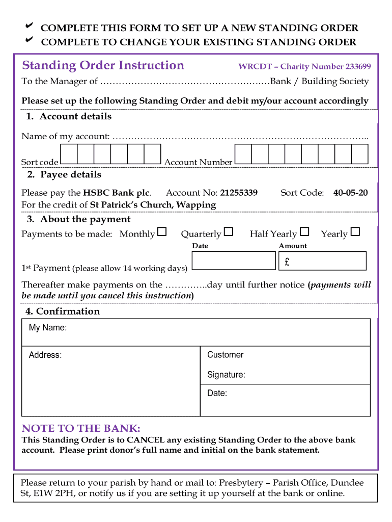 A complete THIS FORM TO SET UP A NEW STANDING ORDER COMPLETE TO CHANGE YOUR EXISTING STANDING Understanding Order InstructionWRCDT Charity Number 233699To the Manager of. Bank / Building Society Please