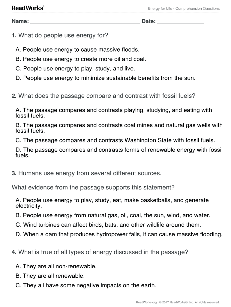 Energy for Life Comprehension Questionnaire: Date: 1. What do people use energy for? A. People use energy to cause massive floods. B. People use energy to create more oil and coal. C. People use energy