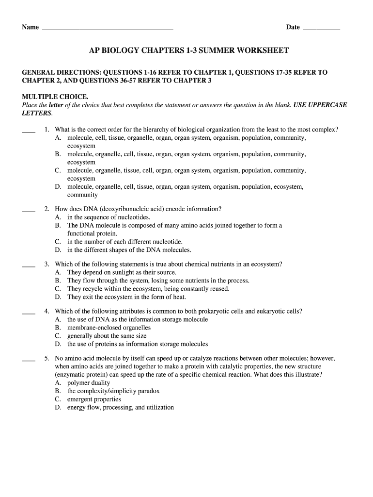 Name Date AP BIOLOGY CHAPTERS 13 SUMMER WORKSHEET GENERAL DIRECTIONS: QUESTIONS 116 REFER TO CHAPTER 1, QUESTIONS 1735 REFER TO CHAPTER 2, AND QUESTIONS 3657 REFER TO CHAPTER 3 MULTIPLE CHOICE. Place