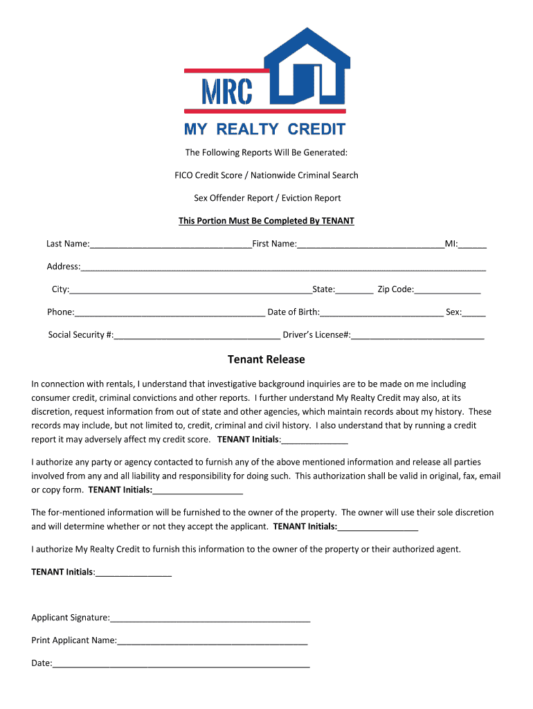 The Following Reports Will Be Generated: FICO Credit Score / Nationwide Criminal Search Sex Offender Report / Eviction Report This Portion Must Be Completed By TENANT Last Name: First Name: MI: Address: