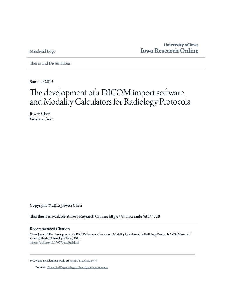 University of Iowa Masthead Logo Iowa Research OnlineTheses and Dissertations Summer 2015The development of a DI COM import software and Modality Calculators for Radiology Protocols Jawed Chen University