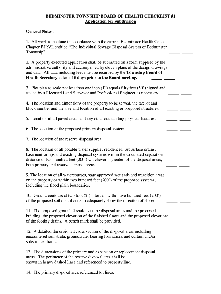 LEOMINSTER TOWNSHIP BOARD OF HEALTH CHECKLIST #1 Application for Subdivision General Notes: 1. All work to be done in accordance with the current Bed minster Health Code, Chapter BH:VI, entitled The