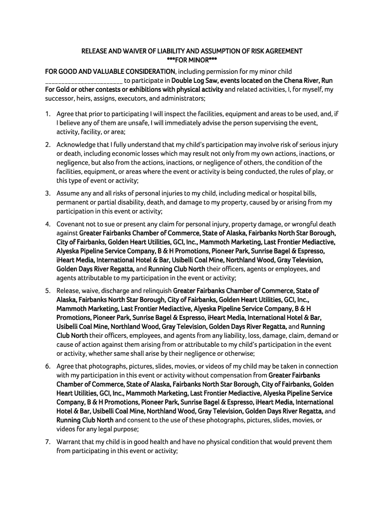 RELEASE AND WAIVER OF LIABILITY AND ASSUMPTION OF RISK AGREEMENT ***FOR MINOR*** FOR GOOD AND VALUABLE CONSIDERATION, including permission for my minor child to participate in Double Log Saw, events