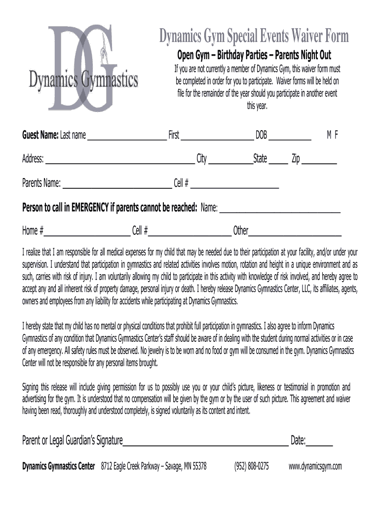 Dynamics Gym Special Events Waiver Form Open Gym Birthday Parties Parents Night Out If you are not currently a member of Dynamics Gym, this waiver form must be completed in order for you to participate.