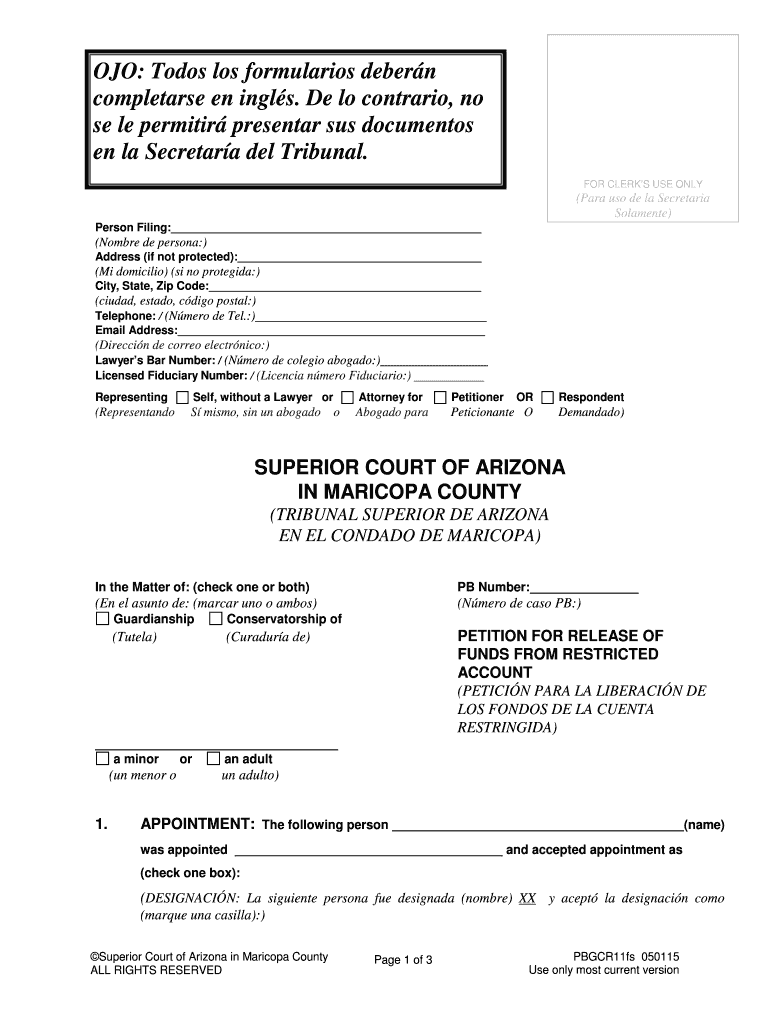 GUARDIANSHIP and/or CONSERVATORSHIP(TUT ELA o CURATOR)1 To Release Restricted Funds (Para liberal Los condos restringing) (Forms Packet) (Series DE formularies) Superior Court of Arizona in Maricopa