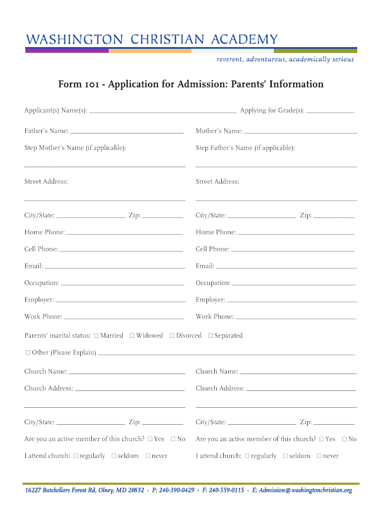 Form 101 Application for Admission: Parents Information Applicant(s) Name(s): Applying for Grade(s): Fathers Name: Mothers Name: Step Mothers Name (if applicable):Step Fathers Name (if applicable):