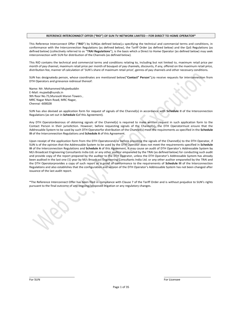 REFERENCE INTERCONNECT OFFER (RIO) OF SUN TV NETWORK LIMITED FOR DIRECT TO HOME OPERATOR* This Reference Interconnect Offer (RIO) by SUN(as defined below), s specifying the technical and commercial