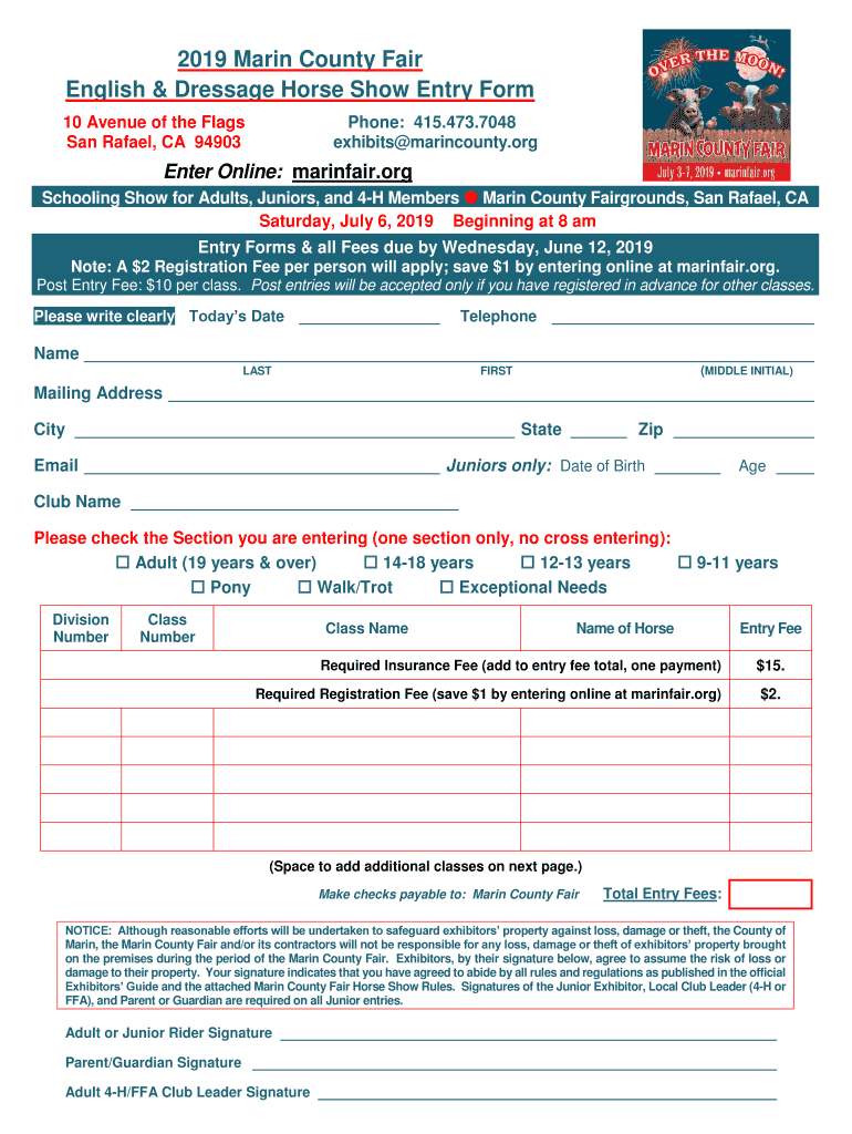 2019 Marin County Fair English & Dressage Horse Show Entry Form 10 Avenue of the Flags San Rafael, CA 94903Phone: 415.473.7048 exhibits marincounty. Oriented Online: mariners.org Schooling Show for