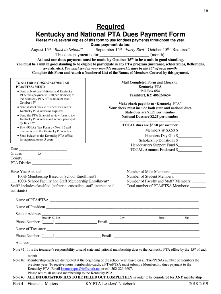 16Required Kentucky and National PTA Dues Payment Form Please make several copies of this form to use for dues payments throughout the year. Dues payment dates:August15thBack to School September 15th