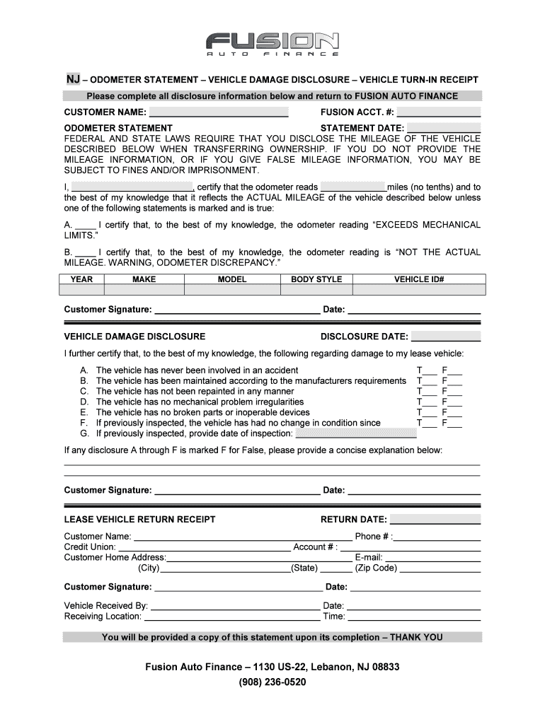 NJ ODOMETER STATEMENT VEHICLE DAMAGE DISCLOSURE VEHICLE TURNING RECEIPT Please complete all disclosure information below and return to FUSION AUTO FINANCE CUSTOMER NAME:FUSION ACCT. #:ODOMETER STATEMENT