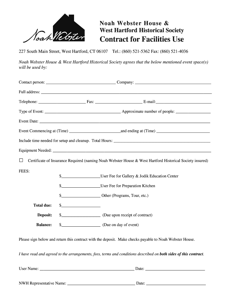 Noah Webster House & West Hartford Historical SocietyContract for Facilities Use 227 South Main Street, West Hartford, CT 06107Tel.: (860) 5215362 Fax: (860) 5214036Noah Webster House & West Hartford
