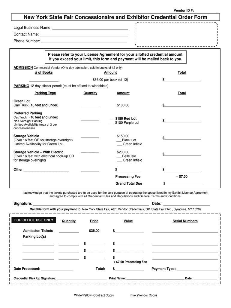 Vendor ID #: New York State Fair Concessionaire and Exhibitor Credential Order Form Legal Business Name: Contact Name: Phone Number: Please refer to your License Agreement for your allotted credential